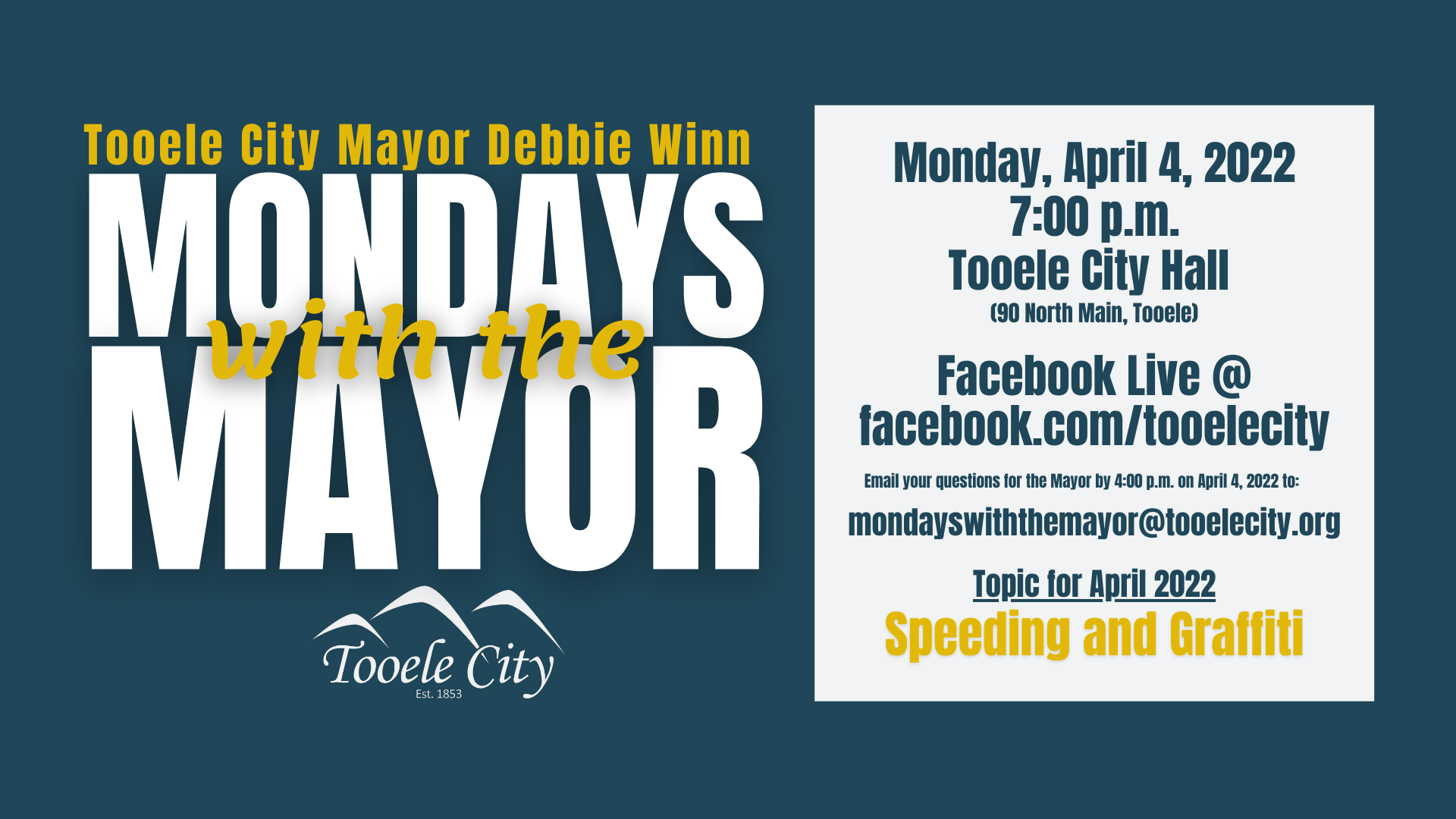 The first Monday with the Mayor will be held on Monday, April 4, 2022 at 7:00 p.m., and is expected to last approximately 30 minutes. The topic for April 2022 will be “How Tooele City is Addressing Speeding and Graffiti Problems”. Residents are encouraged to ask questions on the topic and there are three ways to submit your questions. First, email any questions specific to this topic to mondayswiththemayor@tooelecity.org by 4:00 p.m. on the day of the presentation. Second, ask your questions in person at the presentation. Third, you can comment on the Facebook Live post during the meeting with your questions. The Mayor will do her best to address as many questions as possible.