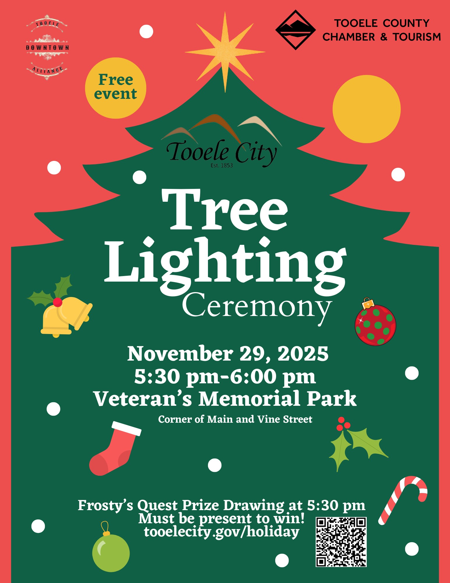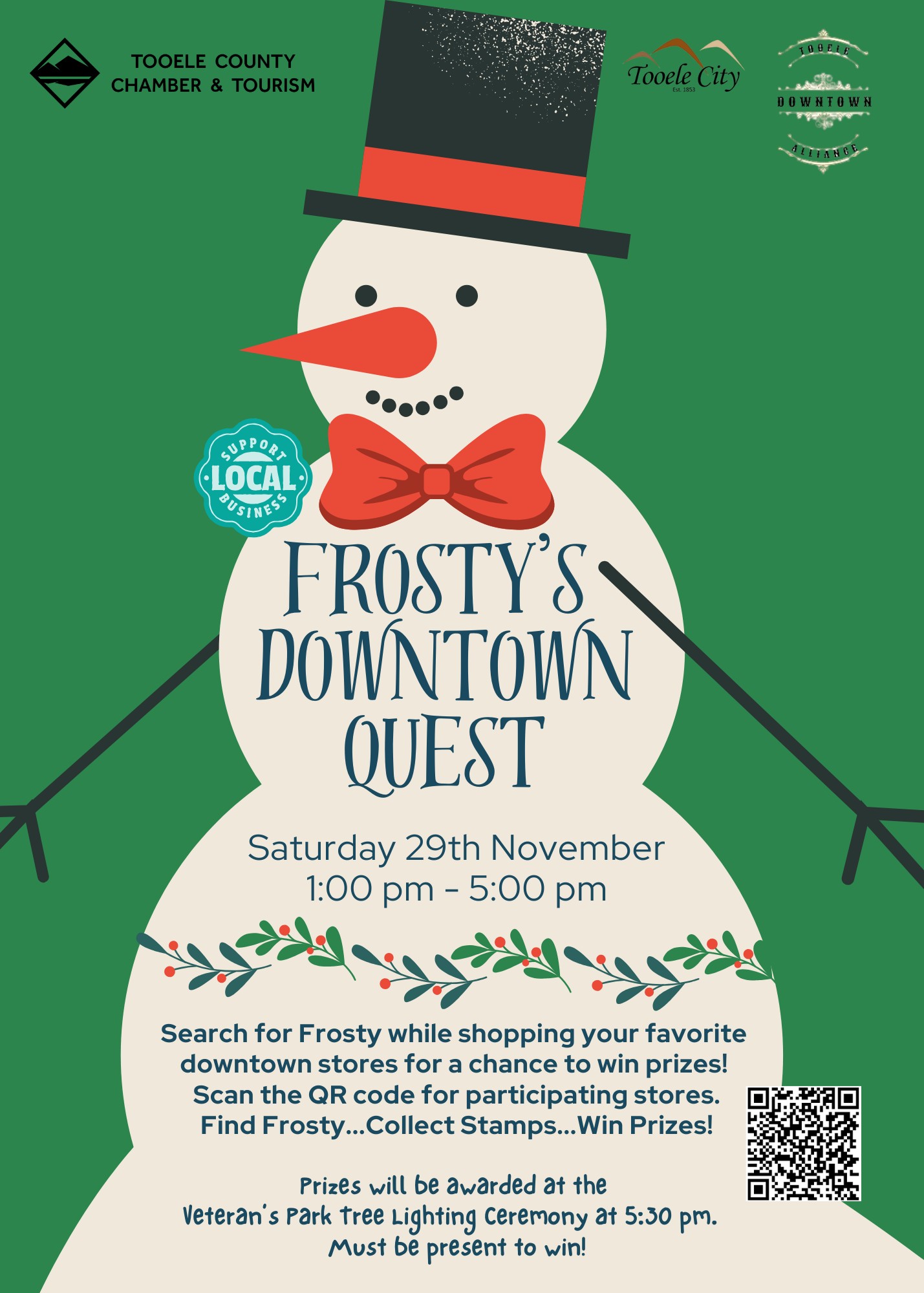 Tooele City Mayor Debbie Winn will lead the Tree Lighting Ceremony this year at Veteran's Park. Bring your friends and your family members to this great event and don't forget to turn in your stamp card for Frosty's Downtown Quest. Participants must be present to claim their prize.