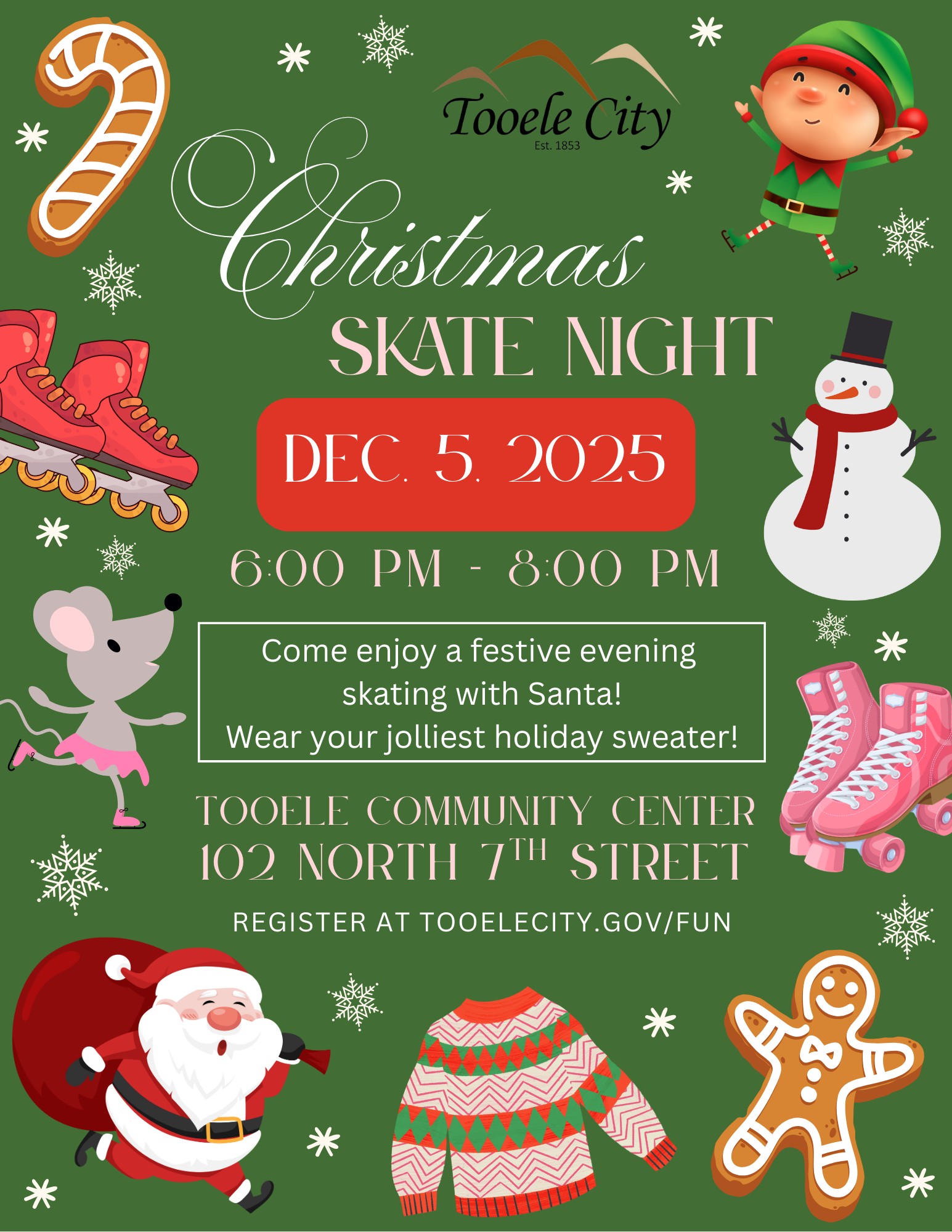 Join us for a festive Christmas Skate Night! Lace up your skates, bring your holiday cheer, and wear your jolliest Christmas sweater for an evening of music, lights, and winter fun.