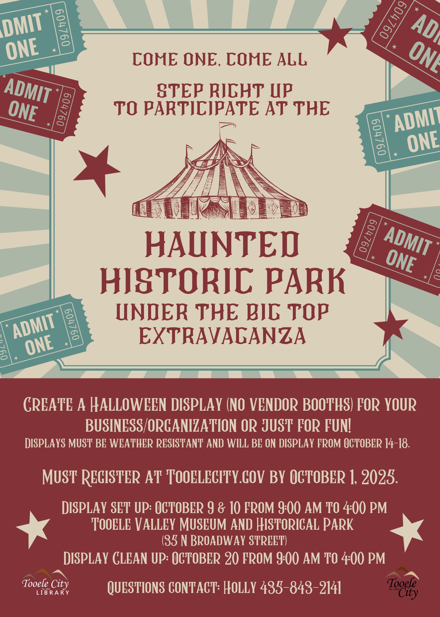 Step right up to participate at the Haunted Historic Park, Under the Big Top Extravaganza! Come create an outdoor display for the Haunted Historic Park, a family event. You’re welcome to include an informational poster as part of your setup, but we ask that no vendor booths or flyers be included.