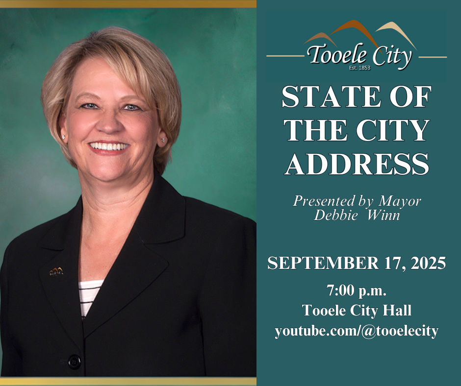 Tooele City invites you to come and listen to the State of the City Address, which will be presented by Tooele City Mayor Debbie Winn at the Tooele City Council Meeting on September 17, 2025 at 7:00 p.m. This event will take place at Tooele City Hall (90 North Main Street, Tooele) in the Council Chambers. If you are unable to attend in person, we invite you to watch on the Tooele City YouTube channel, which you can find by clicking