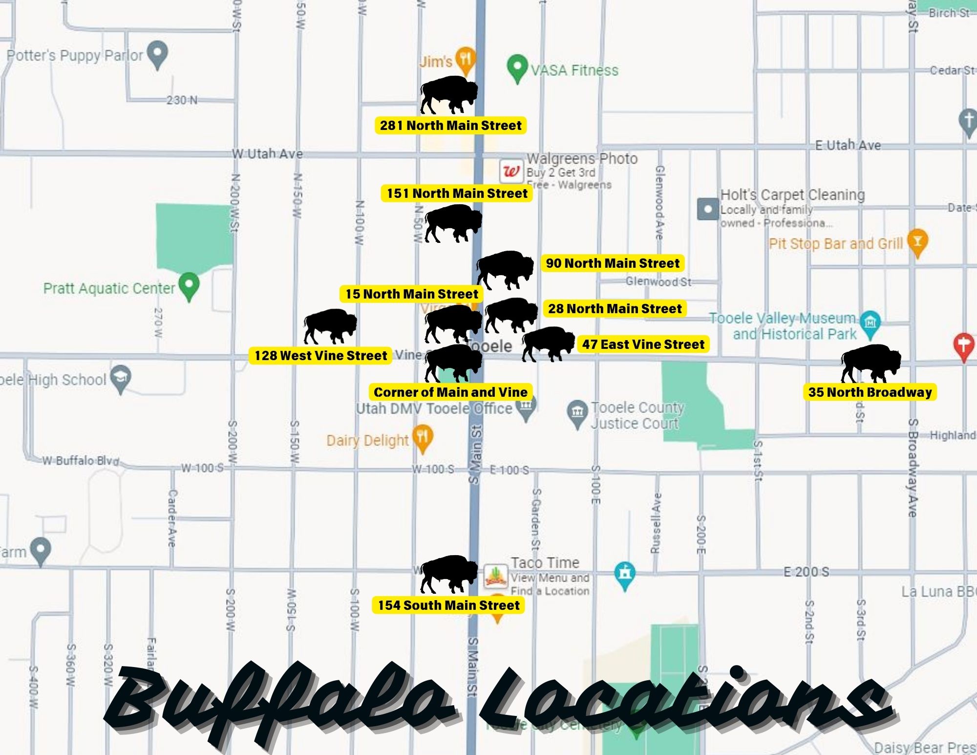 Click on the instruction sheet to get a sneak peek of each statue and their locations around the city. Snap photos of your family with the buffalo you find, and share your favorite shots on the Tooele City Community Engagement Division Facebook page.